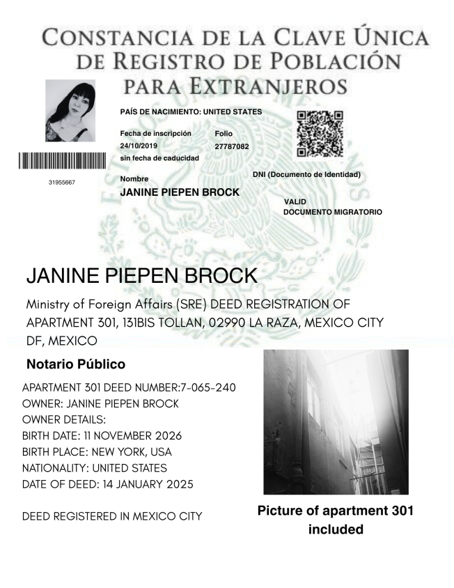 OWNERSHIP DEED AND NUMBER 301 APARTMENT, 131BIS TOLLAN, 02990 LA RAZA, MEXICO CITY DF, MEXICO, OWNERSHIP PROOF OF JANINE PIEPEN BROCK