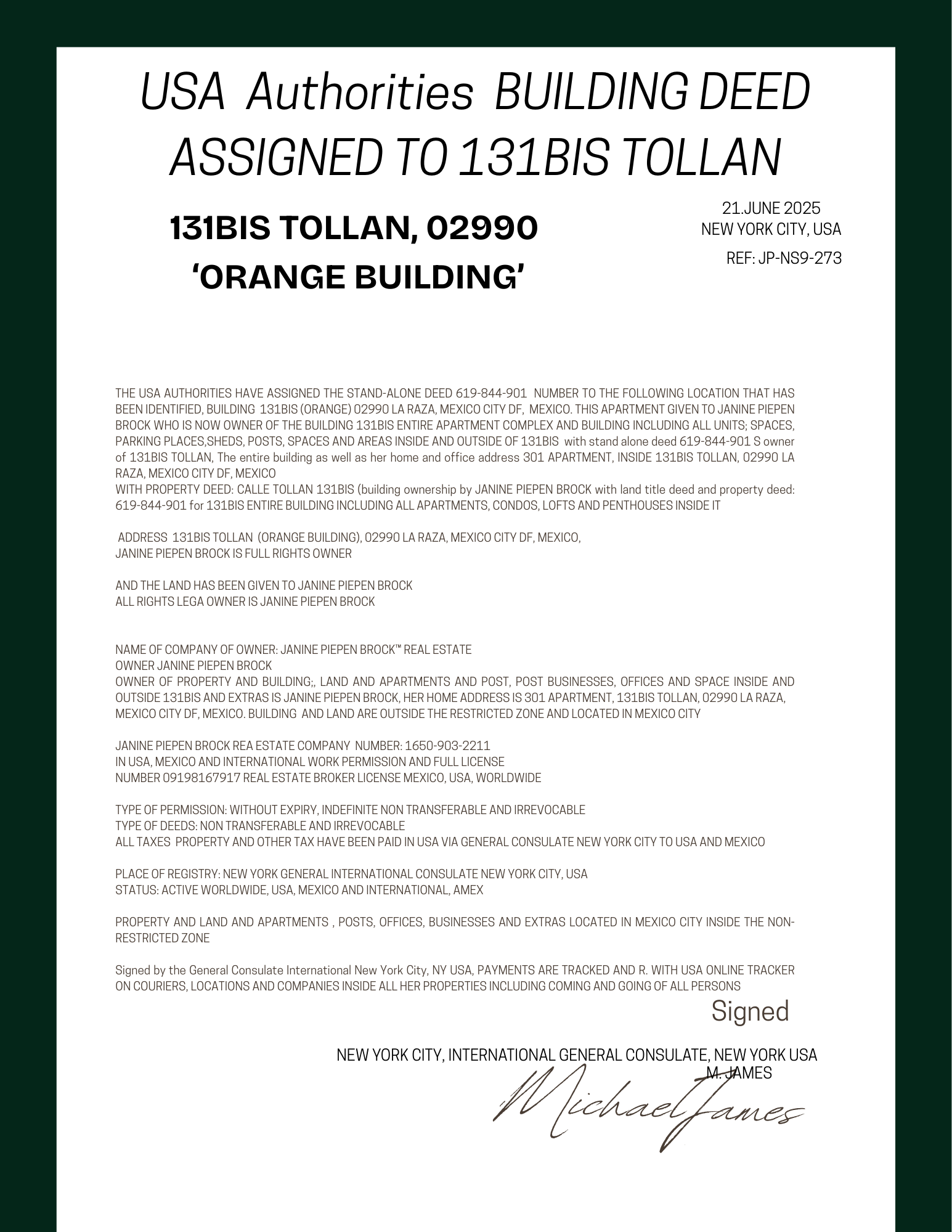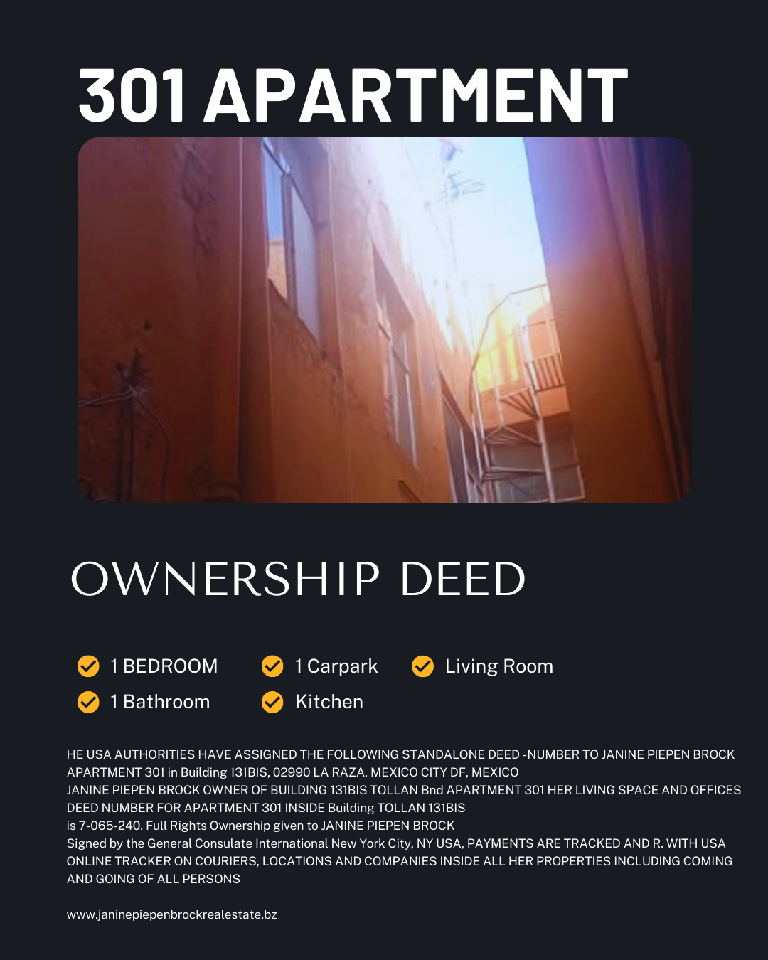 OWNERSHIP DEED AND NUMBER 301 APARTMENT, 131BIS TOLLAN, 02990 LA RAZA, MEXICO CITY DF, MEXICO, OWNERSHIP PROOF OF JANINE PIEPEN BROCK